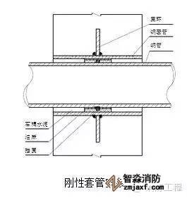 1.剛性套管安裝:主體結構鋼筋綁扎好后,按照給排水施工圖標高幾何尺寸找準位置,然后將套管置于鋼筋中,焊接在鋼筋網中,如果需氣割鋼筋安裝的,安裝后必須用加強筋加固,并做好套管的防堵工作。剛性套管安裝如圖所示:
