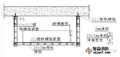 3.線槽橋架在跨越防火分區及線槽穿樓板的部位做防火封堵處理。封堵板用2mm厚防火板,具體做法如圖所示:
