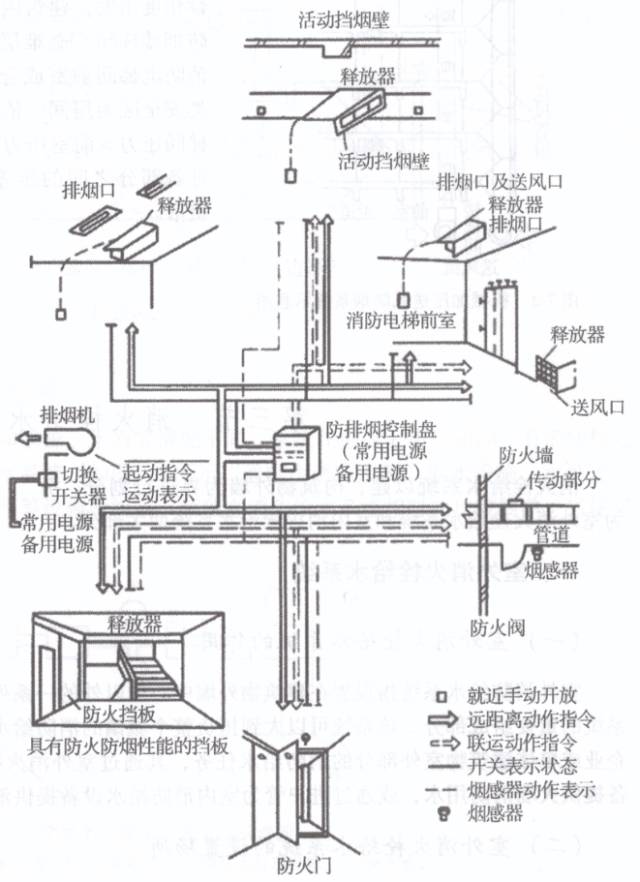 2、原理:火災——手動控制或感煙探測器——控制器主機——開啟檔煙垂壁、排煙口、排煙防火閥——關閉空調、送風管內的防火調節閥——排煙機排煙至室外.