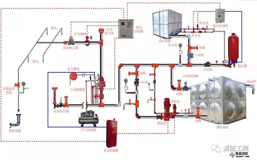 預(yù)作用系統(tǒng)在準工作狀態(tài)時配水管道內(nèi)不充水,由火災(zāi)自動報警器自動開啟預(yù)作用閥后,轉(zhuǎn)換為濕式系統(tǒng),預(yù)作用系統(tǒng)由閉式噴頭、預(yù)作用閥組、充氣設(shè)備(不是必須有)、水流報警裝置、供水設(shè)施及供水配水管道等組成。