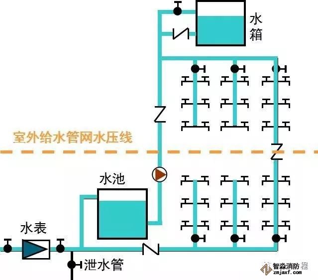 特點(diǎn):供水可靠,系統(tǒng)簡(jiǎn)單,投資省,可充分利用外網(wǎng)水壓。缺點(diǎn)是增加了建筑物的荷載,容易產(chǎn)生二次污染。 適用場(chǎng)所:供水水壓、水量周期性不足時(shí)采用