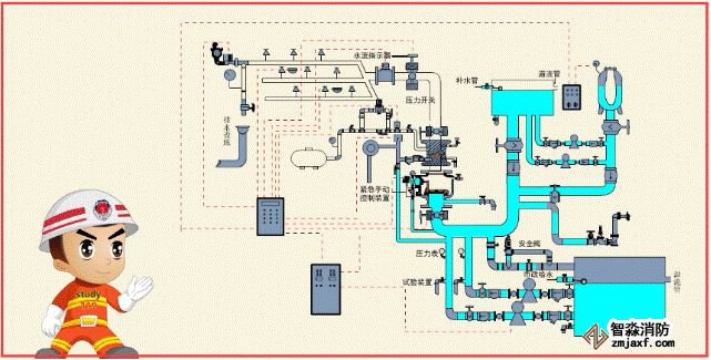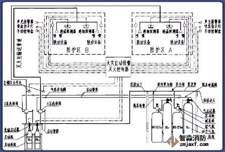 該系統(tǒng)由滅火劑瓶組、加壓氣體瓶組、驅(qū)動(dòng)氣體瓶組(可選)、單向閥、選擇閥、減壓裝置、驅(qū)動(dòng)裝置、集流管、連接管、噴頭、信號反饋裝置、安全泄放裝置、控制盤、檢漏裝置、管道管件及吊鉤支架等組成。