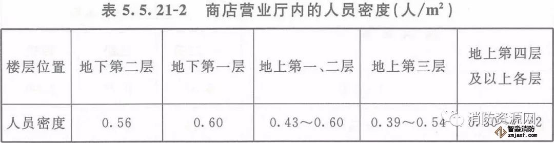 注2:根據表5.5.21-2確定人員密度值時,應考慮商店的建筑規模,當建筑規模較小(比如營業廳的建筑面積小于3000m²)時宜取上限值,當建筑規模較大時,可取下限值。當一座商店建筑內設置有多種商業用途時,考慮到不同用途區域可能會隨經營狀況或經營者的變化而變化,盡管部分區域可能用于家具、建材經銷等類似用途,但人員密度仍需要按照該建筑的主要商業用途來確定,不能再按照上述方法折減。