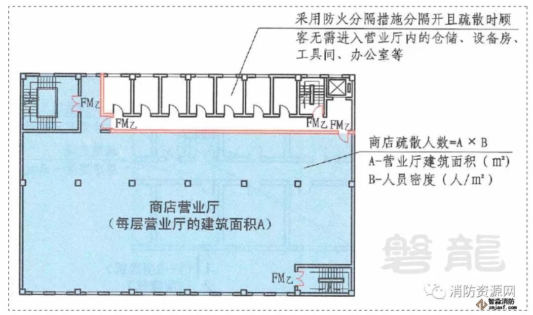 注1:本條所指“營業廳的建筑面積”,既包括營業廳內展示貨架、柜臺、走道等顧客參與購物的場所,也包括營業廳內的衛生間、樓梯間、自動扶梯等的建筑面積。對于進行了嚴格的防火分隔,并且疏散時無需進入營業廳內的倉儲、設備房、工具間、辦公室等,可不計入營業廳的建筑面積。