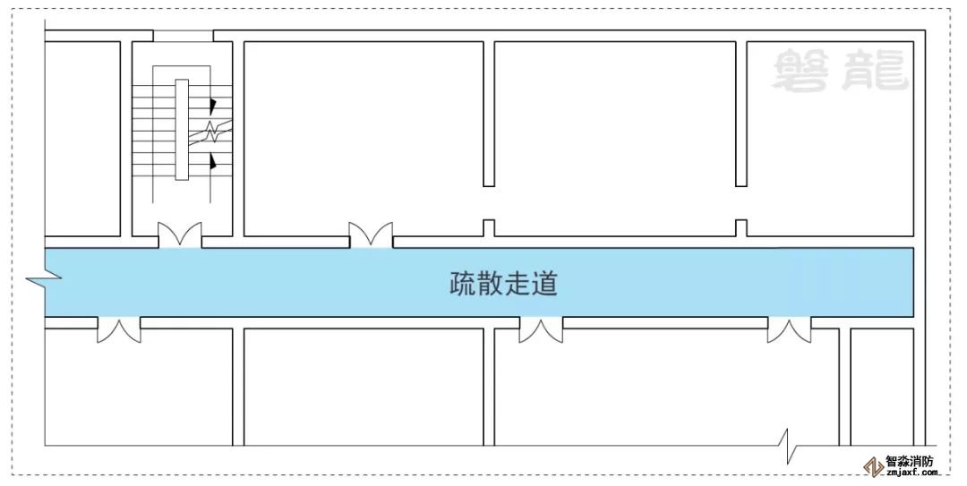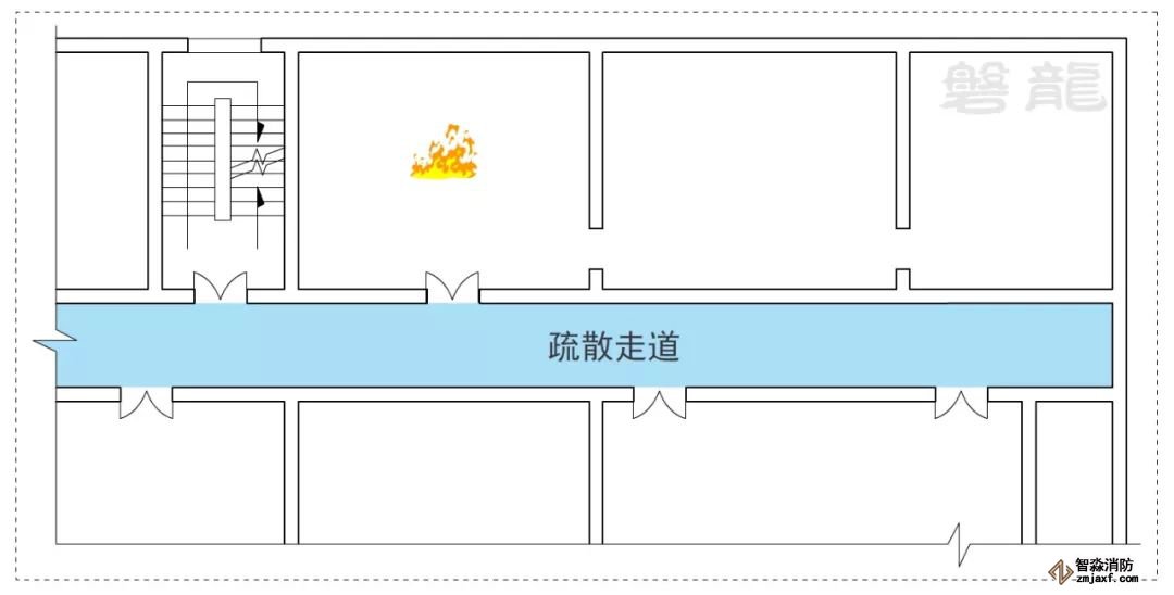 1、室內房間屬于危險區域,一旦發生火災,人員應迅速疏散至相對安全的次危險區域(疏散走道),通過疏散走道疏散至安全出口(圖示1)。