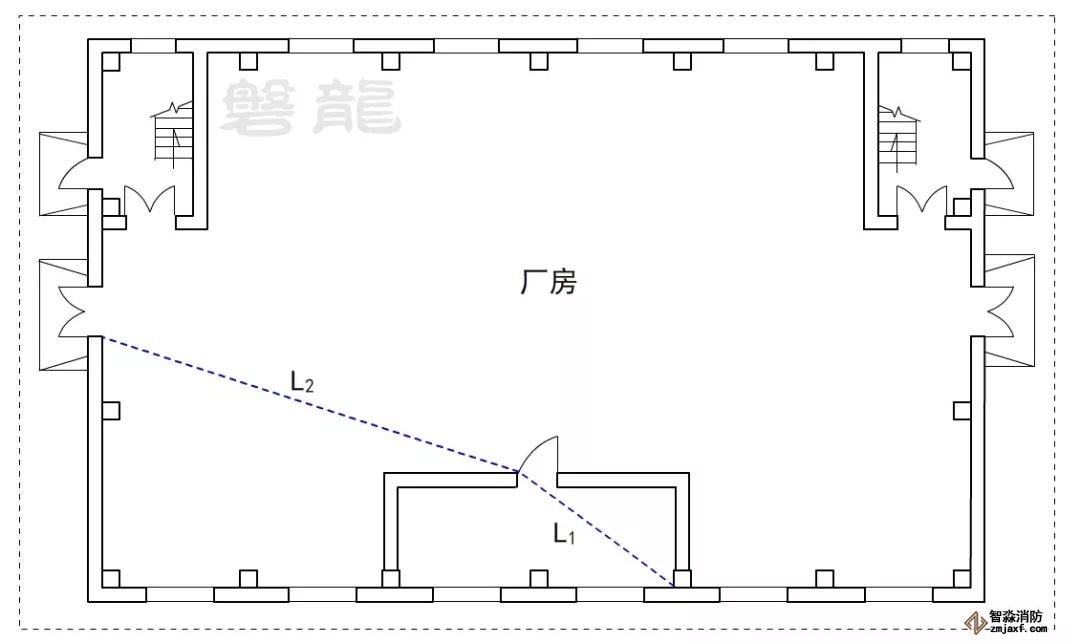 2、廠房倉庫同樣不應采用嵌套(穿套)設置的方式,確因功能需要,嵌套(穿套)設置的房間不應超過一級,疏散距離應按人員行走的直線距離計算,在圖示6的廠房中,示例房間內任一點至安全出口的直線距離,應為L1+L2。