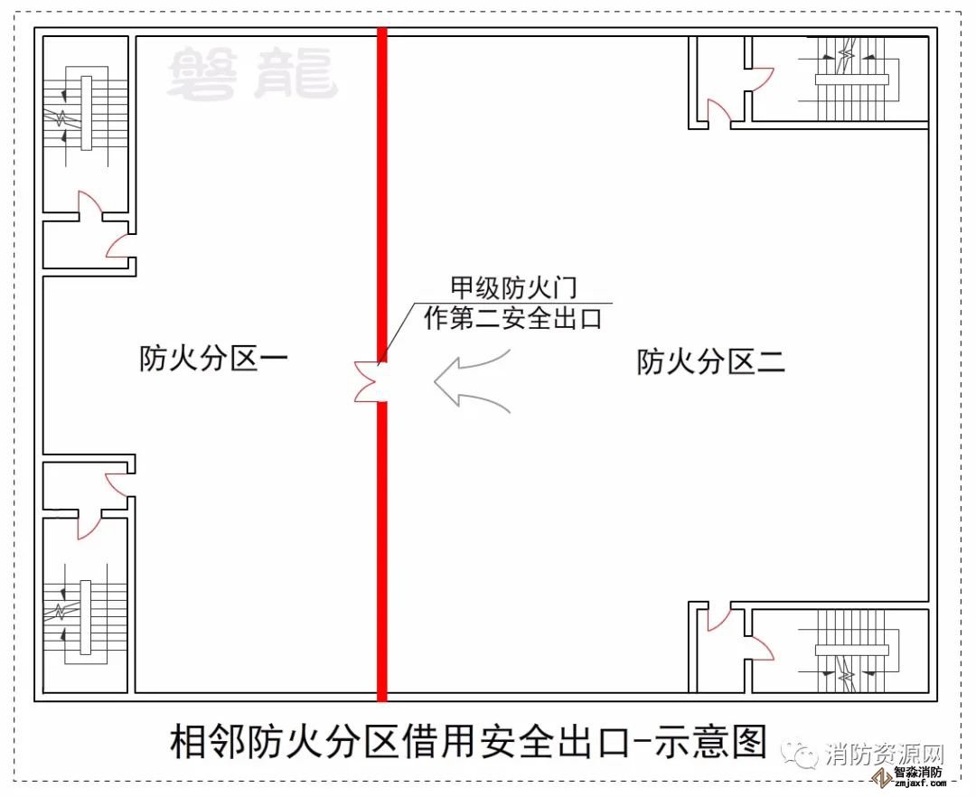 1、耐火等級為一級或二級的公共建筑,相鄰布置的防火分區,如某防火分區的安全出口全部直通室外確有困難,可利用防火墻上通向相鄰防火分區的甲級防火門,作為安全出口,詳見《建規》5.5.9:
