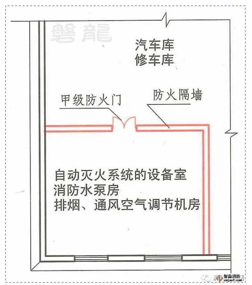 需要說明的是,同時為汽車庫和其他功能部分服務的設備用房,不應劃入汽車庫防火分區,應采用防火墻和耐火極限不低于2.00h的不燃性樓板與汽車庫分隔,且人員不得通過汽車庫疏散,詳見專題:設備用房與汽車庫-疏散關系及應用誤區!