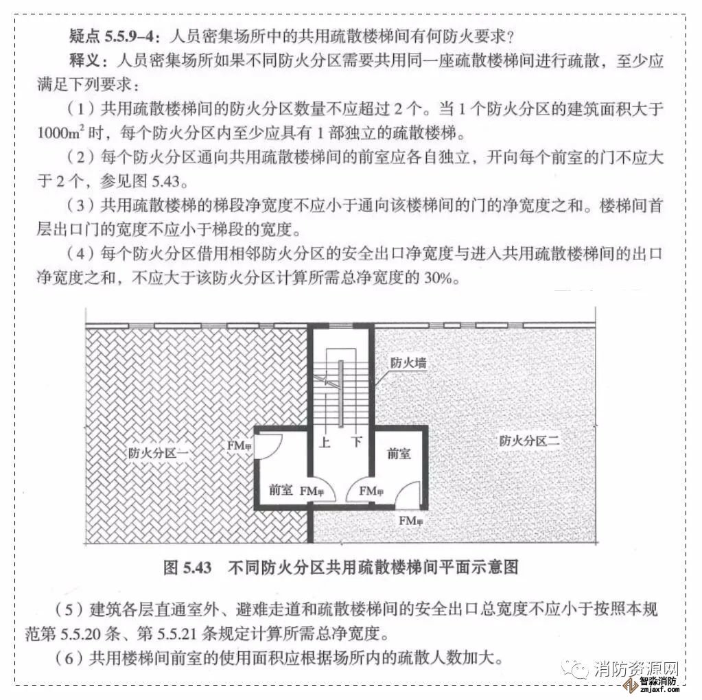 附錄2:“《建筑設計防火規范》GB50016-2014(2018年版)實施指南”關于人員密集場所中的共用疏散樓梯間的防火要求: