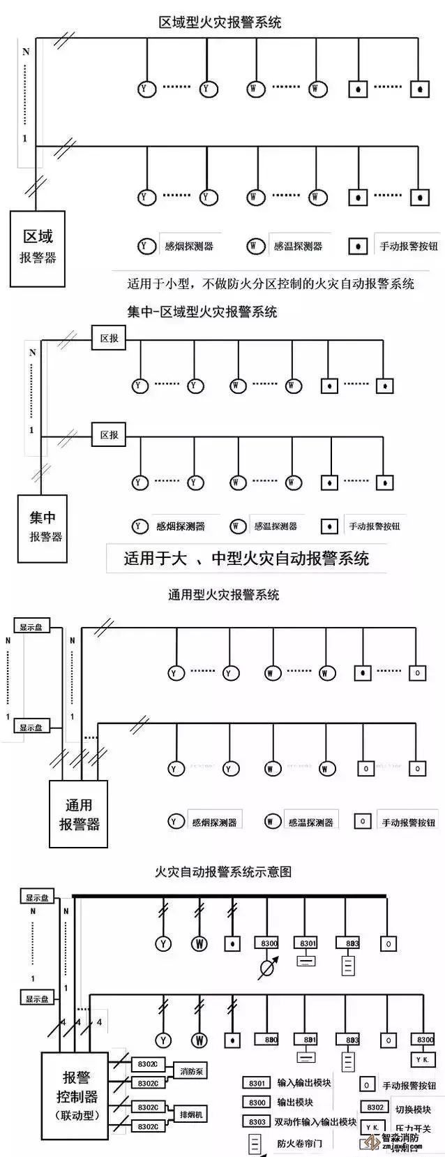 (2)集中報警系統:由集中火災報警控制器、區域(火災)報警控制器和火災探測器組成的功能較復雜的系統。
