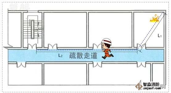 疏散走道是用于人員疏散通行至安全出口或相鄰防火分區的走道,疏散走道的兩側隔墻和樓板應滿足相應建筑耐火等級的燃燒性能和耐火極限要求,疏散走道不能有可燃物,也不能作為工作或作業場所。因此,通常情況下,疏散走道不會是火災發生部位,人員也不會在走道過多逗留。另一方面,疏散走道兩側房間內的疏散距離,也從側面限制了疏散走道的長度。
