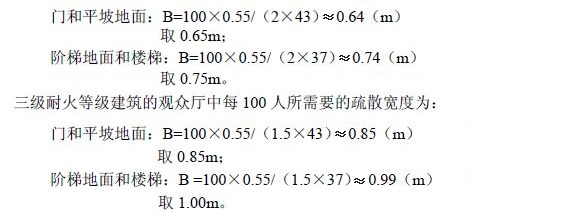 計算出一、二級耐火等級建筑觀眾廳中每100人所需要的疏散寬度分別為: