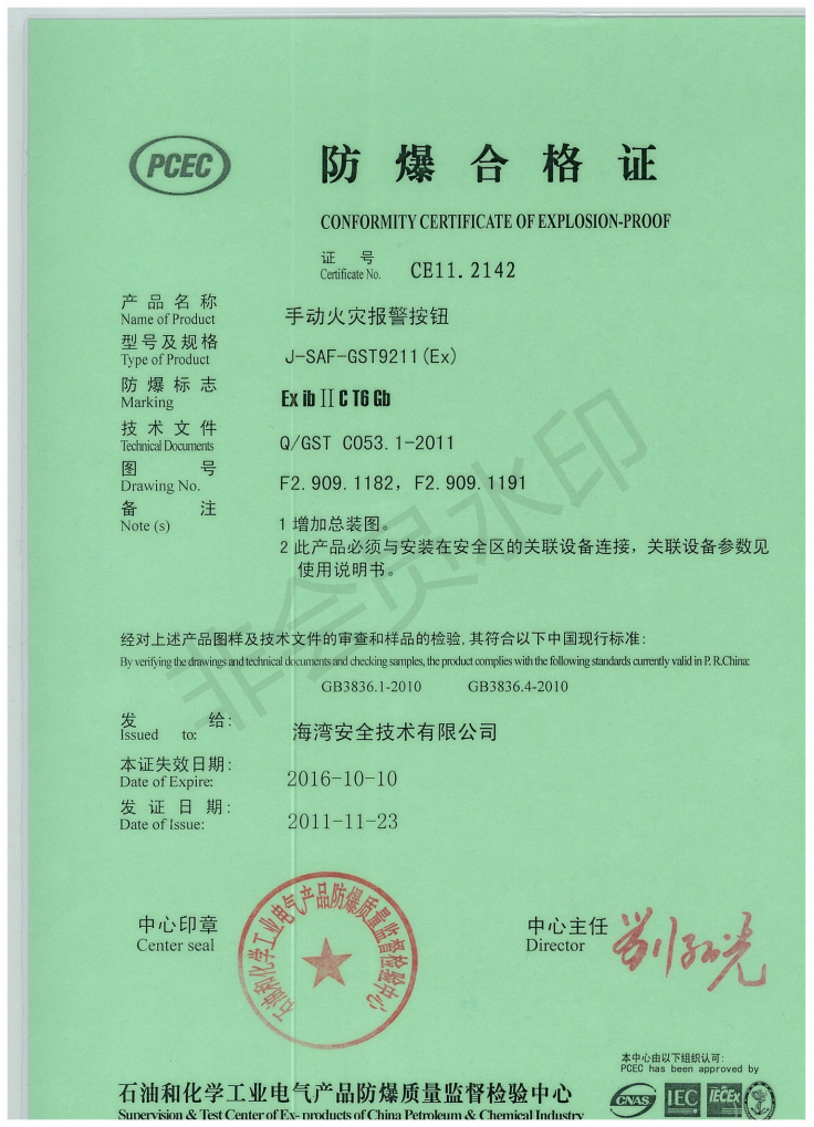合格證中,GST9211-Ex的防爆標志為:Ex d ib II C T6 Gb,按照圖中紅色序號順序,所代表的含義分別為:①防爆標志;②防爆形式;③設備類別;④氣體級別;⑤設備最高表面溫度級別;⑥設備保護級別。