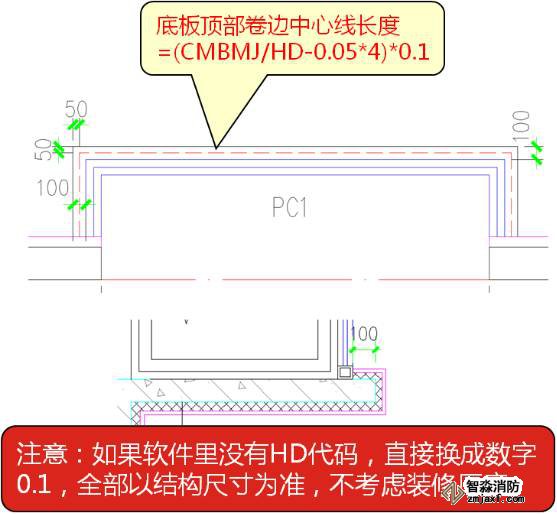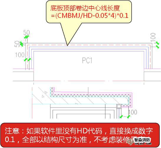 估計很多朋友看不懂“(CMBMJ/HD-0.05*4*0.1”,我解釋下,CMBMJ是飄窗底板側面模板面積,除以HD(厚度)就是側面長度,減去0.05*4就是我們要求底板裝修上翻的中心線長度,在乘以0.1就是上翻的面積。