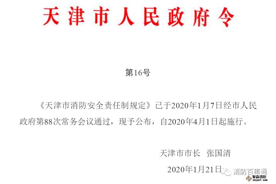 1月7日,天津市消防救援總隊(duì)聯(lián)合市應(yīng)急局起草的《天津市消防安全責(zé)任制規(guī)定》經(jīng)天津市人民政府第88次常務(wù)會議審議,1月21日,市長張國清簽發(fā)第16號市政府令予以公布。