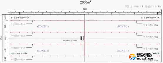 下圖是防火分區2000m2,使用FANFARE-2000探測主機,分為4個探測區域(每區500m2),采樣孔保護面積25.2m2的管路設計圖