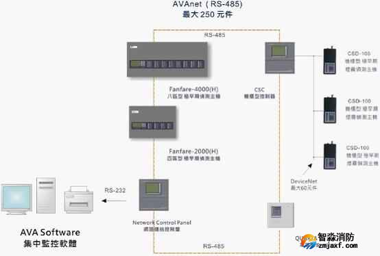 FANFARE-2000四區型極早期煙霧偵測主機,可以通過輸入模塊接入火災自動報警報警控制器;也可以全部聯網,并由AVA系統管理軟件對整個系統進行設置和監控。AVA系統管理軟件安裝在消防控制室的計算機上,用戶可以通過它對整個探測系統的所有性能進行設置、調試和監控。