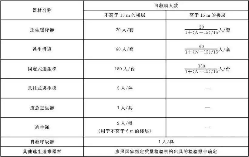 (1)逃生避難器材的配備數(shù)量應(yīng)滿足器材可救助人數(shù)之和不小于逃生避難人數(shù)的要求。