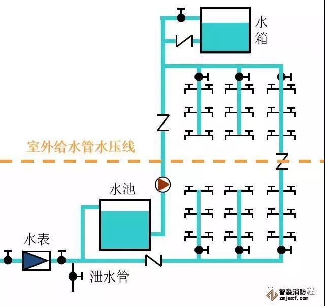 室外給水管網(wǎng)的水壓經(jīng)常不足時采用。