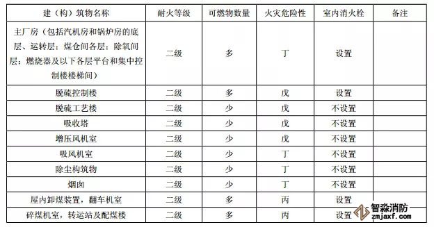 脫硫工藝樓,增壓風(fēng)機室,吸收塔,吸風(fēng)機室,屋內(nèi)高壓配電裝置(無油),除塵構(gòu)筑物,運煤棧橋,運煤隧道,油浸變壓器檢修間,油浸變壓器室,供、卸油泵房,油處理室,岸邊水泵房、中央水泵房,灰漿、灰渣泵房,生活消防水泵房,穩(wěn)定劑室、加藥設(shè)備室,進水、凈水構(gòu)筑物,冷卻塔,化學(xué)水處理室,循環(huán)水處理室,啟動鍋爐房,供氫站,推煤機庫,消防車庫,貯氫罐,空氣壓縮機室(有潤滑油),熱工、電氣、金屬實驗室,天橋,排水、污水泵房,各分場維護間,污水處理構(gòu)筑物,電纜隧道,材料庫棚,機車庫,警衛(wèi)傳達室。