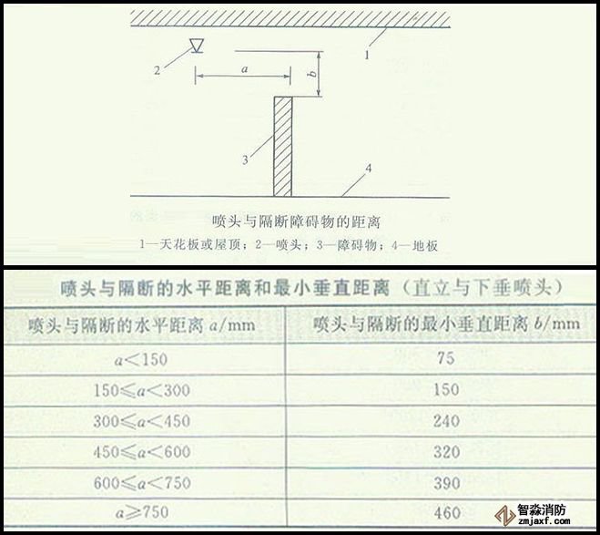 · 當(dāng)噴頭安裝在不到頂?shù)母魯喔浇鼤r,噴頭與隔斷的水平距離和最小垂直距離應(yīng)符合下表的規(guī)定: