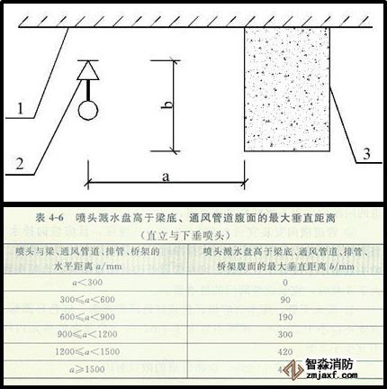 · 當(dāng)噴頭濺水盤高于附近梁底或?qū)挾刃∮?.2m的風(fēng)管、排管、橋架腹面時,噴頭濺水盤高于梁底、風(fēng)管、排管、橋架腹面的最大垂直距離應(yīng)符合下表的規(guī)定: