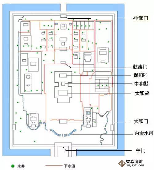 紫禁城排水系統總體規劃是東西方向的雨水匯入南北干溝,然后流入內金水河。各個宮殿院落均設有干溝、支溝、明溝、暗溝、涵洞、流水溝眼等眾多排水設施。