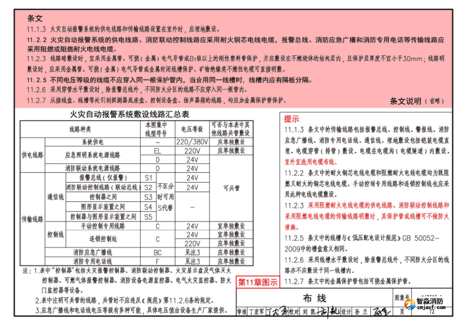 提示11.2.3 采用阻燃耐火電線電纜的供電線路、消防聯動控制線路和采用阻燃電線電纜的傳輸線路明敷時,其保護管或線槽可不做防火措施。