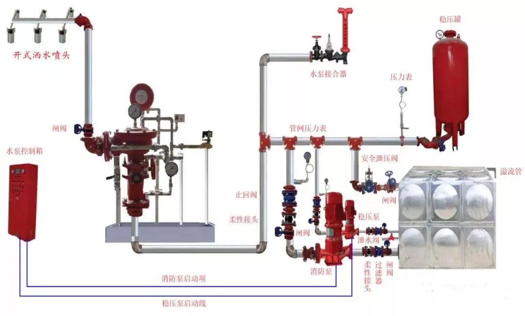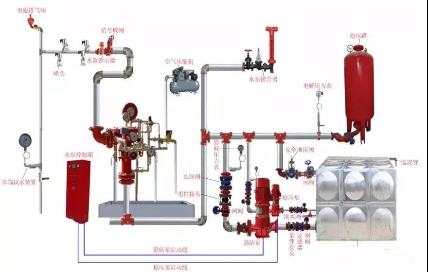 6、 預作用系統在準工作狀態時配水管道內不充水,由火災自動報警器自動開啟預作用閥后,轉換為濕式系統,預作用系統由閉式噴頭、預作用閥組、充氣設備(不是必須有)、水流報警裝置、供水設施及供水配水管道等組成。