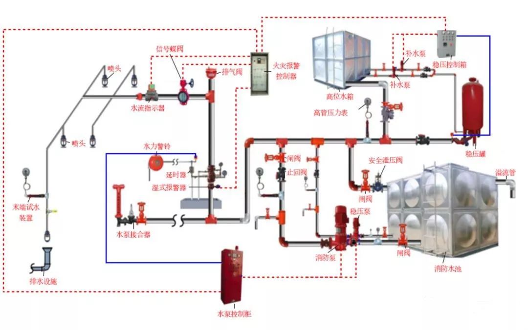 3、 各不同系統的區別主要體現在管道填充物及各組件上。其中比較常見的自動噴水滅火系統有濕式系統、干式系統和預作用系統和雨淋系統。