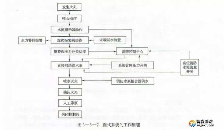 在壓力差的作用下,原來處于關閉狀態的濕式報警閥自動開啟。此時,壓力水通過濕式報警閥流向官網,同時打開通向水力警鈴的通道,延遲器充滿水后,水力警鈴發出聲響警報,高位消防水箱流量開關或系統官網的壓力開關動作并輸出信號直接啟動供水泵。供水泵投入運行后,完成系統的啟動過程。