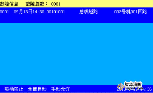 消防報警系統某個回路總線發生短路、線間電流過大時,控制器發出聲、光報警,同時在液晶屏上以中文顯示總線短路(見下圖),打印機、歷史記錄記錄相應的故障信息。